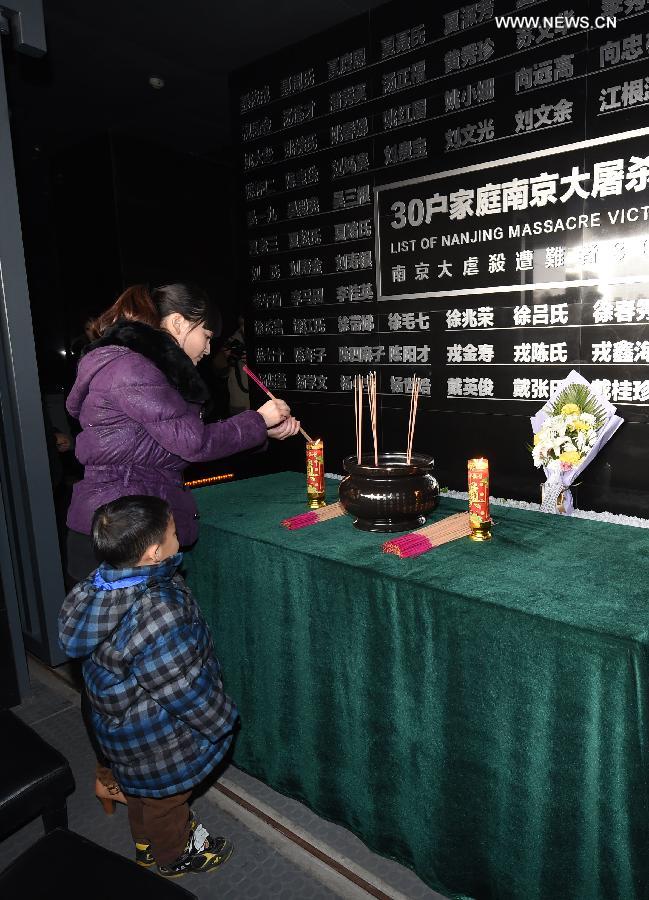 A woman takes a young boy to mourn their family members in front of a wall with "List of Nanjing Massacre Victims in 30 Families" at the Memorial Hall of the Victims in Nanjing Massacre by Japanese Invaders in Nanjing, capital of east China's Jiangsu Province, Dec. 1, 2014. A series of ceremonies were held by people to mourn their family members killed in the 1937 massacre ahead of the National Memorial Day for Nanjing Massacre Victims, which falls on Dec. 13. (Xinhua/Sun Can)
