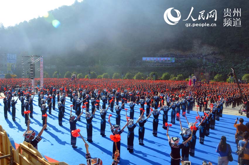 Nearly 10,000 Buyi people (an ethnic group living in south China) in national costumes danced together in Ceheng county, southwest China’s Guizhou province on Nov. 29, 2014. A certifier from the Guinness World Record granted the certificate “Buyi bamboo drum dance and Zhuanchang dance Guinness world record” to this dance after the performance. (Photo source: gz.people.cn)