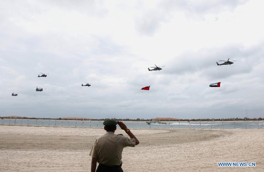 A service man solutes while military helicopters fly in formation to celebrate the 43rd anniversary of the founding of the United Arab Emirates (UAE) in Abu Dhabi, capital of the UAE, on Dec. 1, 2014. The UAE greets its national foundation day on Dec. 2 annualy. (Xinhua/An Jiang)