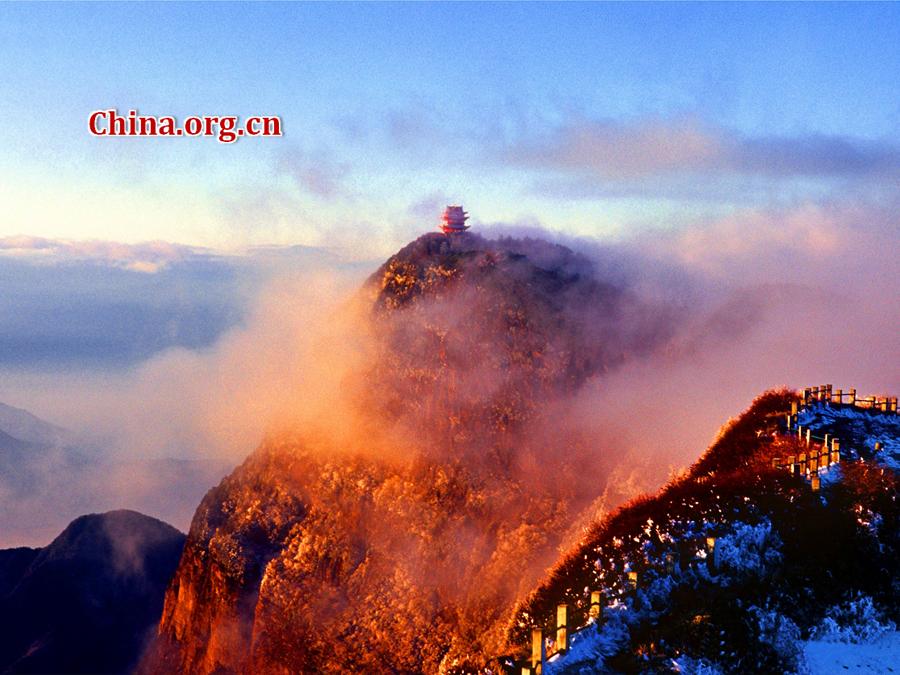 The Golden Summit is one of four scenic areas at Mt. Emei, a towering, beautiful mountain in central Sichuan province. The Golden Summit, the mountain's main peak at 3,079.3 meters above sea level, seems to almost touch the sky. There are four classic scenes at the Golden Summit: the sea of clouds, the sunrise, the "Buddha rays", and the "saint lamps." [China.org.cn by Zuo Jiang]