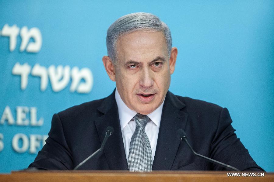 Israeli Prime Minister Benjamin Netanyahu speaks during a press conference at his office in Jerusalem, Dec. 2, 2014. Israeli Prime Minister Benjamin Netanyahu announced his support for dispersing the Knesset (parliament) and conducting early elections amid a coalition crisis. Netanyahu also said he has ordered to fire Justice Minister Tzipi Livni and Finance Minister Yair Lapid, who he said plotted against him by outspokenly criticizing his policies. (Xinhua/JINI)