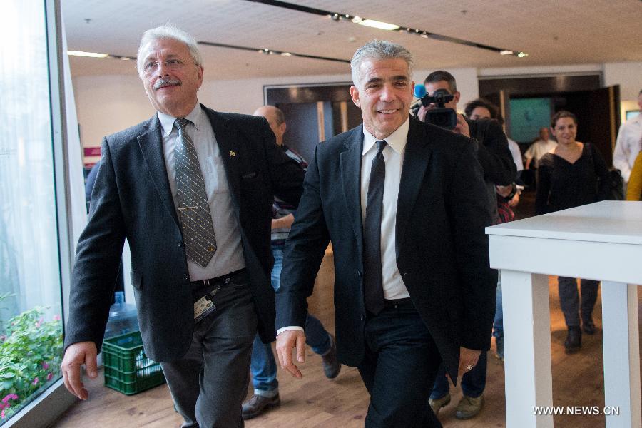 Israeli Finance Minister Yair Lapid (R, front) leaves after a finance conference in Jerusalem, Dec. 2, 2014. Israeli Prime Minister Benjamin Netanyahu announced his support for dispersing the Knesset (parliament) and conducting early elections amid a coalition crisis. Netanyahu also said he has ordered to fire Justice Minister Tzipi Livni and Finance Minister Yair Lapid, who he said plotted against him by outspokenly criticizing his policies. (Xinhua/JINI)