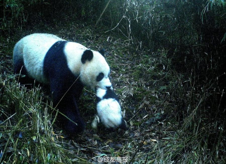 Photo taken by an infrared camera shows a wild panda who grabs a cub by the neck with teeth walking in bamboo forest in Jiuzhaigou, or Jiuzhai Valley, located in the Aba Tibetan and Qiang autonomous prefecture of northwestern Sichuan province. Local wildlife protection office said on Tuesday that it is the first time to shoot a wild panda and its cub at the same time. [Photo: Sina Weibo account of Chengdu Business Daily]
