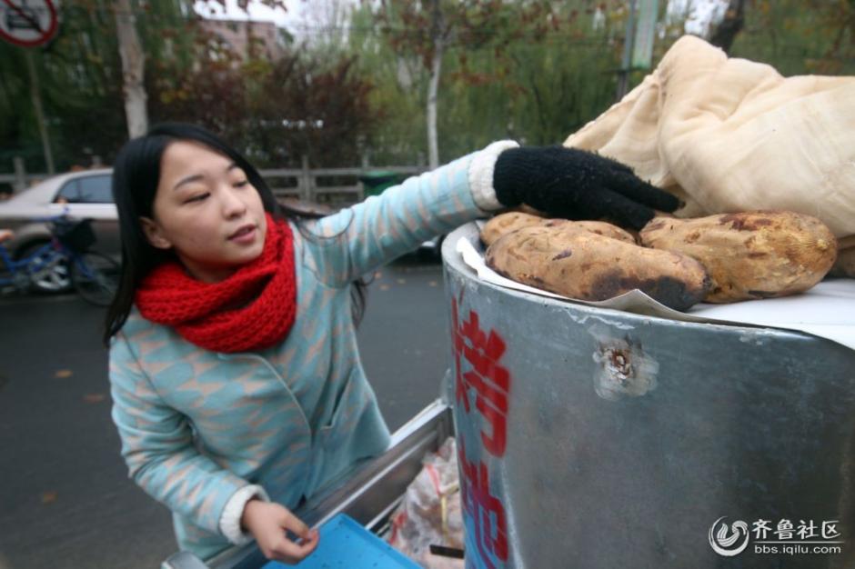 Wang Yan, 22, used to be a nurse in a private clinic in Jinan, east China’s Shandong province. Unfortunately her brother got leukemia and the treatment would cost a large sum of money. To make more money, she decided to sell sweet potatoes in the street. She gets up at 5 a.m. every day to roast sweet potatoes and goes out to peddle them in the street at 8 a.m. She can earn 180-200 yuan a day. (Photo/ iqilu.com)