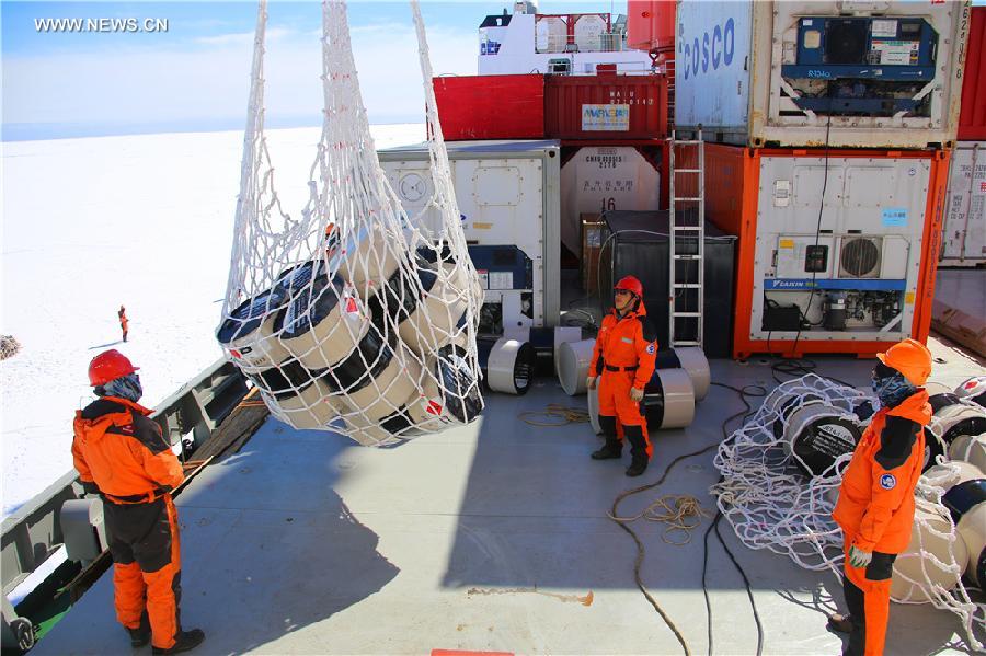 Members of the Chinese scientific expedition team on the Icebreaker Xuelong, or Snow Dragon, unload supplies and prepare to head for the Antarctic Zhongshan Station, a Chinese scientific research base in Antarctica, Dec. 3, 2014. (Xinhua/Bai Yang)