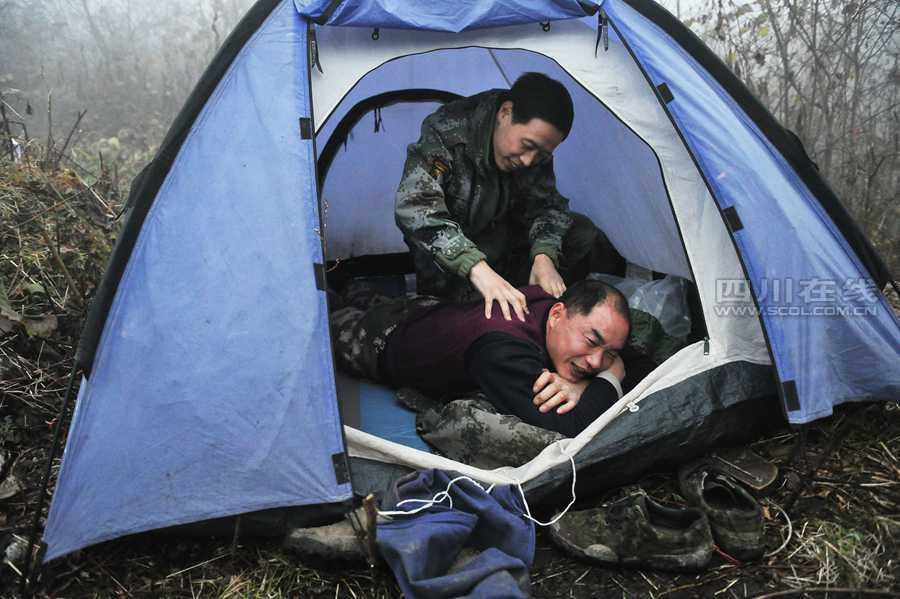 A ranger massages the back of his team member.(Photo/SCOL.com.cn)
