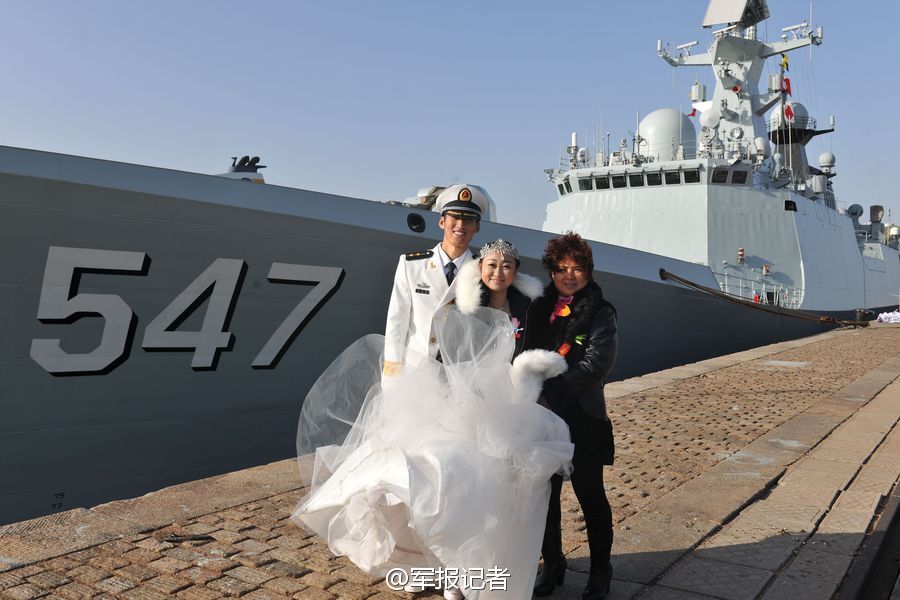 A collective wedding is held at a naval base of the North Sea Fleet for 18 soldiers who are going to execute escort mission in Gulf of Aden on Dec. 1, 2014. (Photo/Weibo of Liberation Army Daily)