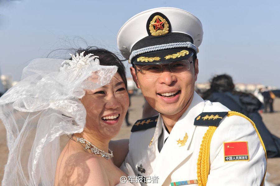 A collective wedding is held at a naval base of the North Sea Fleet for 18 soldiers who are going to execute escort mission in Gulf of Aden on Dec. 1, 2014. (Photo/Weibo of Liberation Army Daily)