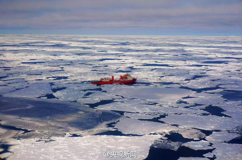 | China's 31st Antarctic expedition unloads goods near the Antarctic ice sheet as a crowd of penguins gather around it. On Dec.4, 2014, Chinese research vessel and icebreaker Xuelong (Snow Dragon) set off from Shanghai on the country's 31st Antarctic expedition. It is scheduled to return in next April. (Photo/CCTV News official microblog) |