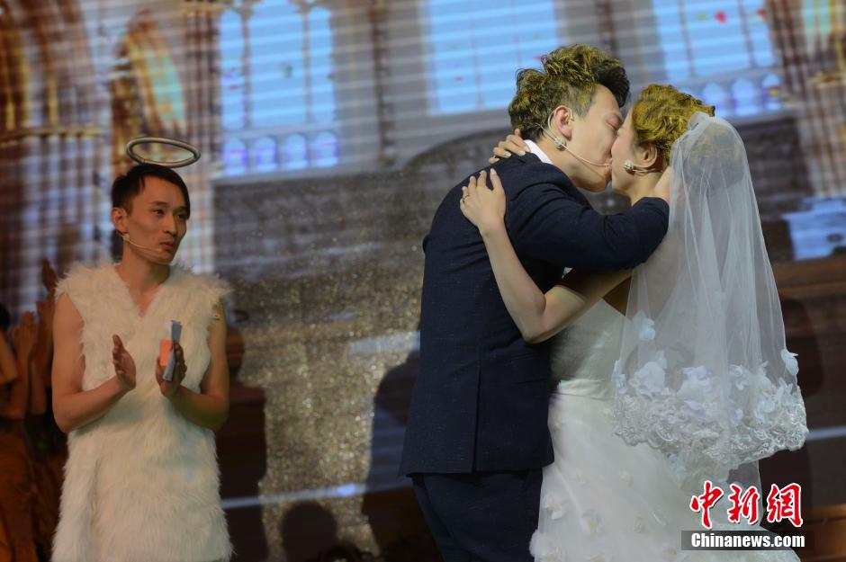 A drama wedding is held in Taiyuan, north China's Shanxi on Dec. 7, 2014. The bride and the groom were the leading actor and actress in the drama. The plot of the drama is based on their love storyline from how they met to fell in love with each other. In China, post-90s couples are becoming the major consumers of wedding industry. They usually prefer more personalized wedding plans. (Chinanews/Wei Liang)