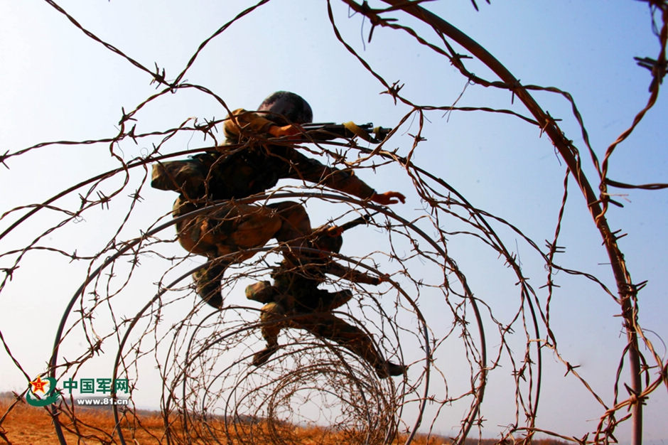 Two soldiers quickly cross the barbed wire. In later November 2014, the Nanjing Military Region organized its new recruits to conduct a comprehensive exercises based on the tactical operation course. (Photo/81.cn)