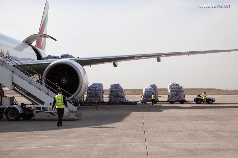 A cargo plane carrying China's humanitarian aid items arrives in Erbil International Airport in the Iraqi Kurdish regional capital of Erbil, Dec. 9, 2014. Two aircraft carrying the China's humanitarian aid items arrived in Erbil, the capital city of Iraqi Kurdish region on Tuesday. (Xinhua/Chen Xu)