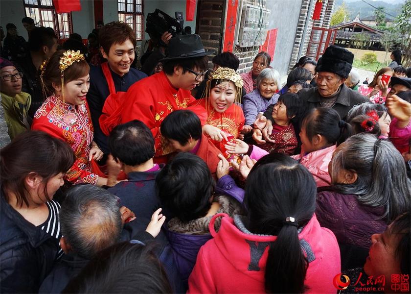 Six pairs of bride and grooms from Shanghai hold a traditional wedding ceremony with local characteristics. (Photo/People.cn)
