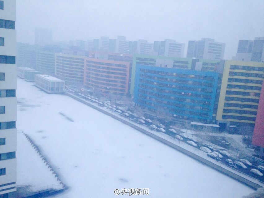 Beijing witnesses its first snowfall in this winter on Dec. 9, 2014. Snowfall brought humidity and cleaned up the air for Beijing, which has suffered from the lack of precipitation.(Photo/CCTV news offical microblog)