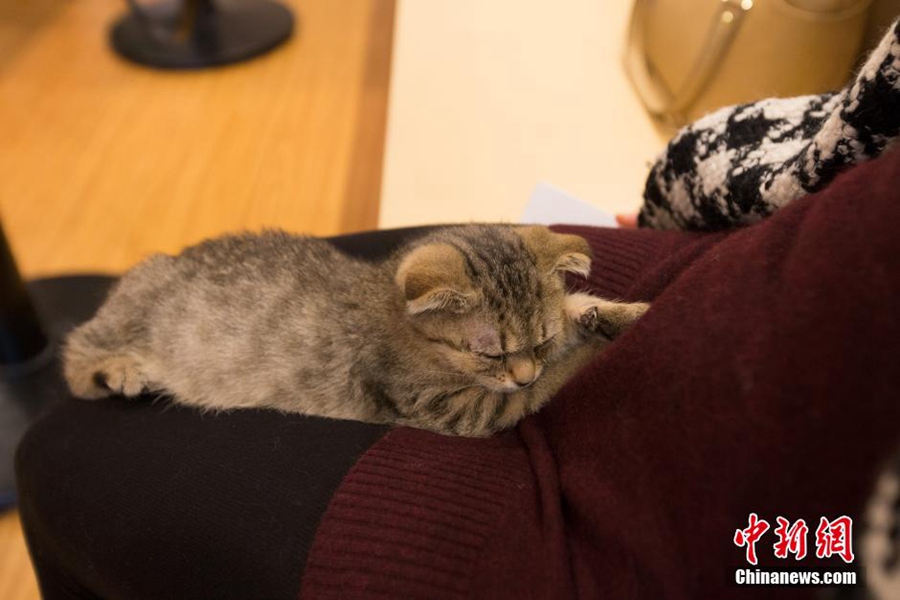 The cute cat lies on the legs of one reader. (CNS/Su Yang)