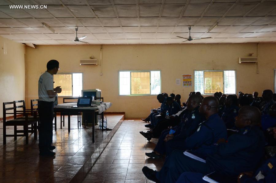 | Sierra Leoean policemen learn how to protect themselves from Ebola disease during a training given by Chinese public health experts at the Police Club in Freetown, capital of Sierra Leone, on Dec. 10, 2014. Chinese public health trainers arrived in Freetown on Nov. 10 to give lessons to 500 local policemen in the next few days. (Xinhua/Cao Zheng) |