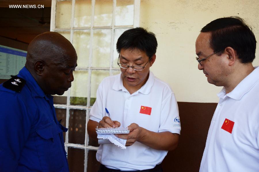 A policeman (L) asks questions on how to protect themselves from Ebola disease after a training given by Chinese public health experts at the Police Club in Freetown, capital of Sierra Leone, on Dec. 10, 2014. Chinese public health trainers arrived in Freetown on Nov. 10 to give lessons to 500 local policemen in the next few days. (Xinhua/Cao Zheng)