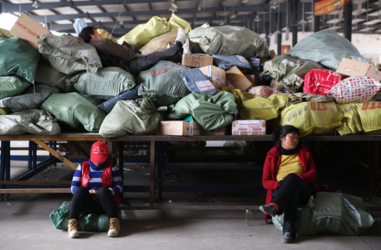 | Three casual worker take a nap during the break at an express company.(Photo/People.cn) |
