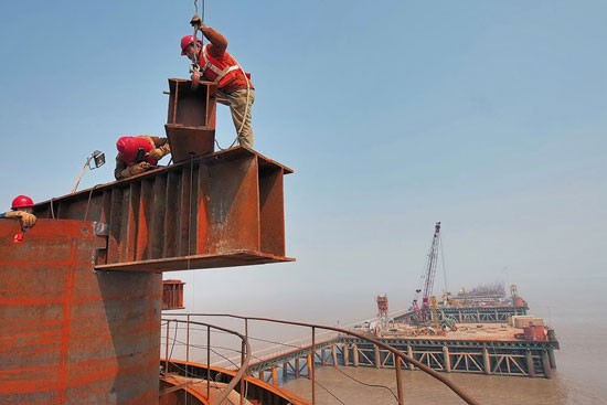 | Worker hoisting bridge pier at the construction site of Jiaxing-Shaoxing cross-sea bridge(Photo/People.cn) |