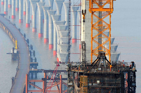 Workers on the tower of Jiaxing-Shaoxing cross-sea bridge(Photo/People.cn)