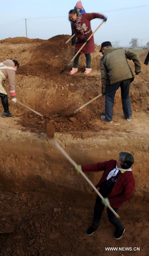 People work in graves at the excavating spot of ancient relics of the Han Dynasty (202 BC-220 AD), in Wenxian County, central China's Henan Province, Dec. 11, 2014. (Xinhua/Zhu Xiang)