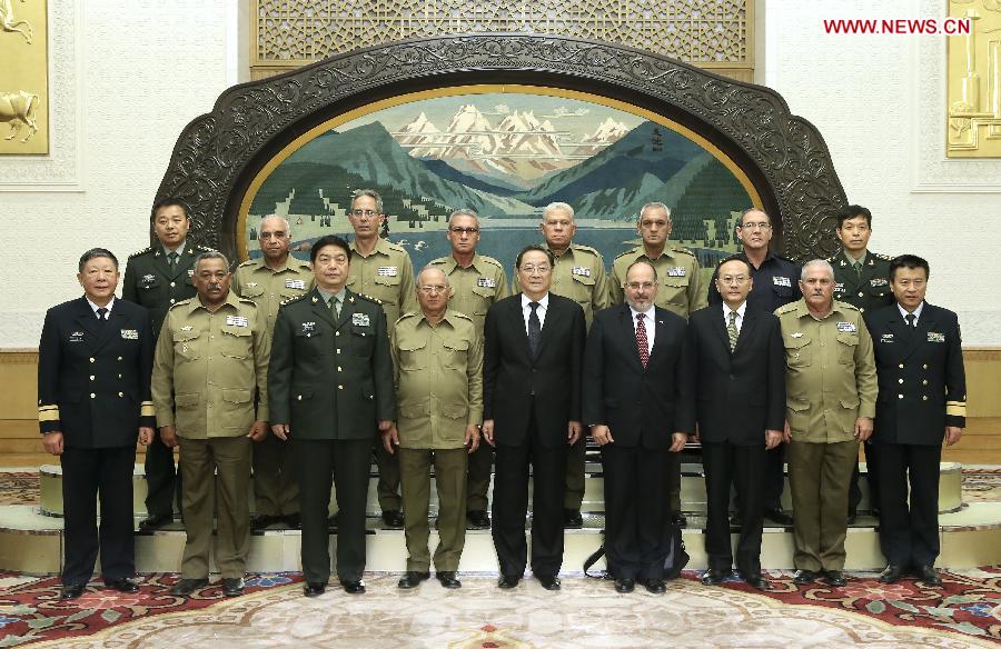 Yu Zhengsheng (C, front), chairman of the National Committee of the Chinese People's Political Consultative Conference (CPPCC), meets with Cuban Minister of the Revolutionary Armed Forces Leopoldo Cintra Frias (4th L, front) in Beijing, capital of China, Dec. 11, 2014. (Xinhua/Pang Xinglei)