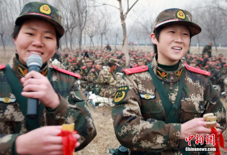 More than 3,000 new female recruits of Beijing Armed Police Force receive training in suburb of Beijing on Dec. 9, 2014. Training subjects include forced march, camping and military boxing in order to strengthen physical condition of the new recruits. (CNS/Yang Huifeng)