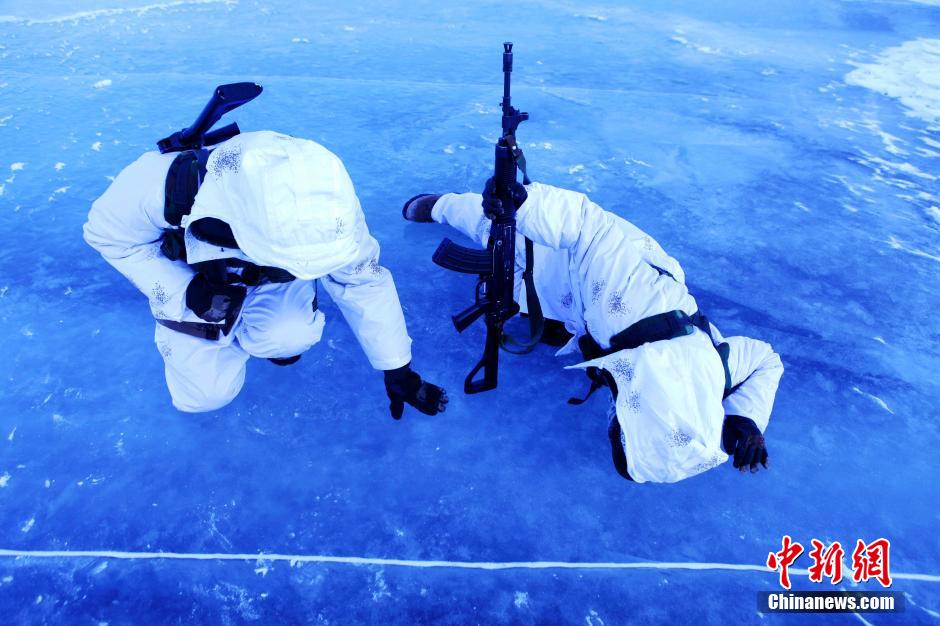 Xin Guoqiang and Zhang Bo, two sentries of the “Good Eighth Company in Heihe”, patrol at the China-Russia boundary river in severe cold of minus 32 degrees Celsius on Dec. 10, 2014. (Chinanews/Wei Jianshun)