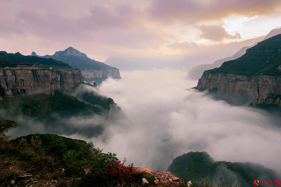 Located 40 kilometers east of Lingchuan county, north China’s Shanxi province, Xiyagou Valley is at the foot of Wangmangling Mountain, which is famous for its perilous peaks and sea of clouds. The valley is about 1,000 meters lower than the peaks around, making the landscape exceptionally splendid. (Photo source: people.cn)