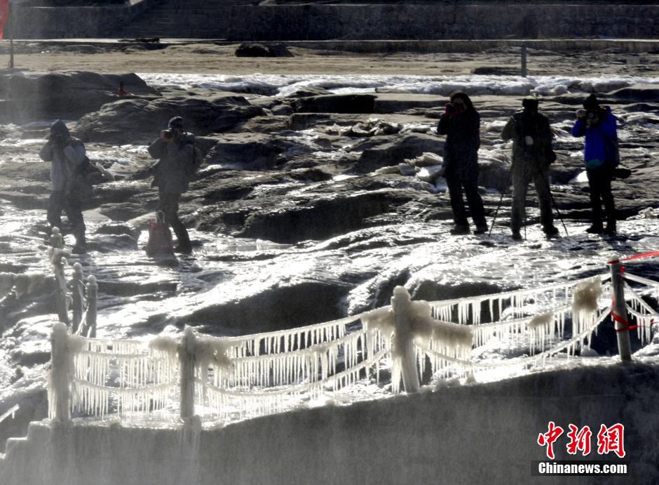 Silver thaw is formed along both sides of the Hukou waterfall of Huanghe River, north China's Shanxi province as temperature drops on Dec. 11, 2014. The spectacular scene of icefall and ice pillars attracted many tourists. (Chinanews/Rao Beicheng)