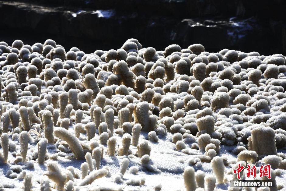 Silver thaw is formed along both sides of the Hukou waterfall of Huanghe River, north China's Shanxi province as temperature drops on Dec. 11, 2014. The spectacular scene of icefall and ice pillars attracted many tourists. (Chinanews/Rao Beicheng)
