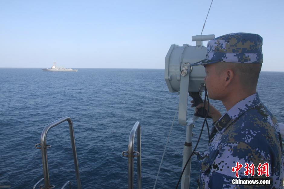 Chinese naval vessels conduct an unplanned encounter drill with US counterparts in Gulf of Aden in accordance with the Code for Unplanned Encounters at Sea (CUES). This is the first unplanned encounter drill between China and the US in the region. (Chinanews/Xiao Yong)