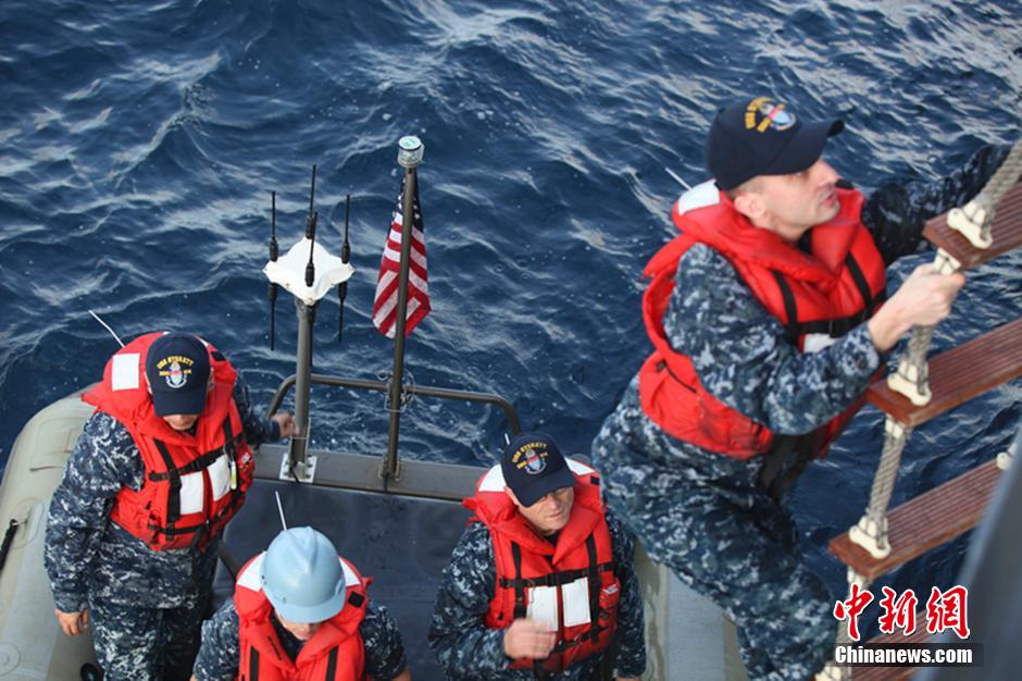 Chinese naval vessels conduct an unplanned encounter drill with US counterparts in Gulf of Aden in accordance with the Code for Unplanned Encounters at Sea (CUES). This is the first unplanned encounter drill between China and the US in the region. (Chinanews/Xiao Yong)