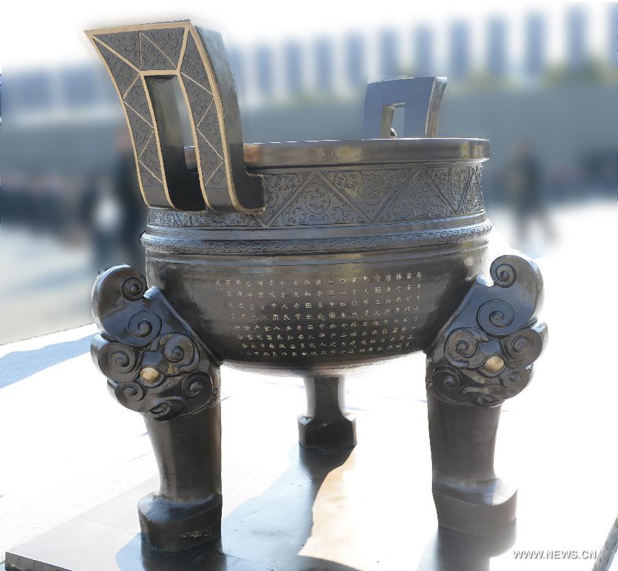 Photo taken on Dec. 13, 2014 shows the memorial "ding," a type of ancient Chinese cauldron symbolizing state power and prosperity, for the Nanjing Massacre victims at the state ceremony for China's first National Memorial Day for Nanjing Massacre Victims at the memorial hall for the massacre victims in Nanjing, east China's Jiangsu Province. Chinese President Xi Jinping, along with Xia Shuqin, an 85-year-old massacre survivor, and a school child, unveiled the "ding". (Xinhua/Ma Zhancheng)