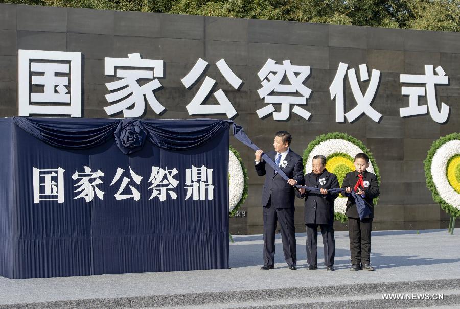 Chinese President Xi Jinping (L), along with Xia Shuqin (C), an 85-year-old massacre survivor, and a school child, dedicates a "ding," a type of ancient Chinese cauldron symbolizing state power and prosperity, to the Nanjing Massacre victims during the state ceremony for China's first National Memorial Day for Nanjing Massacre Victims at the memorial hall for the massacre victims in Nanjing, east China's Jiangsu Province, Dec. 13, 2014. (Xinhua/Ma Zhancheng)
