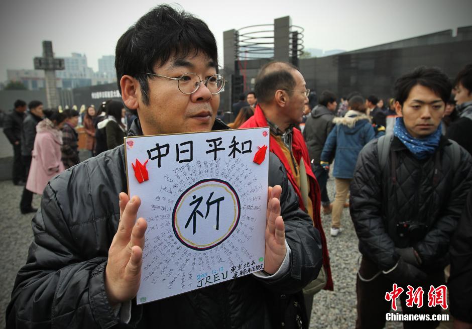 A friendly personage takes part in the International Peace Assembly, holding a paper board with the words “China-Japan Peace and Friendship” on Dec. 13, 2011. (CNS/Yang Bo)