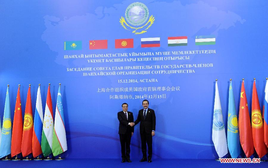 Chinese Premier Li Keqiang (L) is greeted by his Kazakh counterpart Karim Masimov as attending the 13th prime ministers' meeting of the Shanghai Cooperation Organization (SCO) in Astana, Kazakhstan, Dec. 15, 2014. (Xinhua/Rao Aimin)