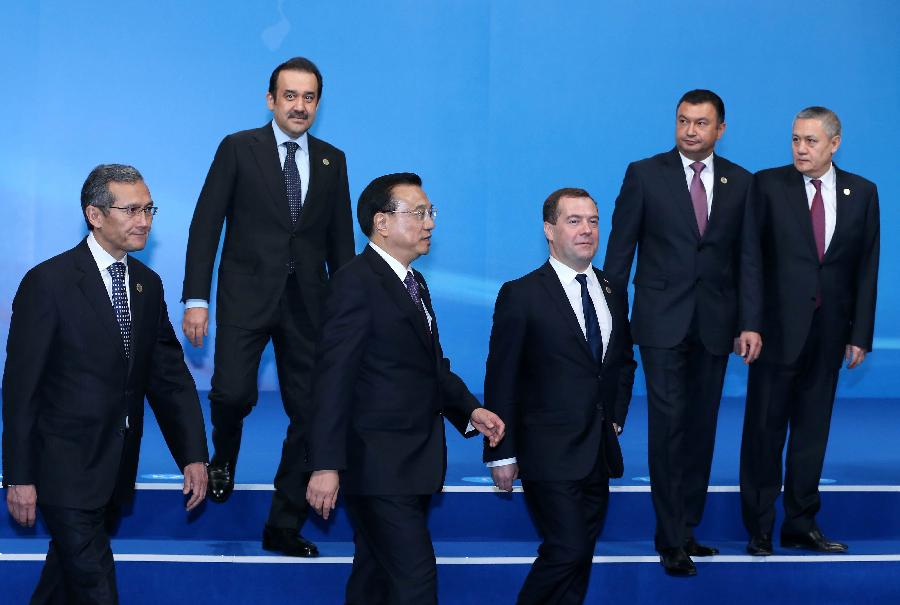 | Chinese Premier Li Keqiang (3rd L) and other leaders walk to the meeting venue after they pose for a group photo during the 13th prime ministers' meeting of the Shanghai Cooperation Organization (SCO) in Astana, Kazakhstan, Dec. 15, 2014. (Xinhua/Pang Xinglei) |