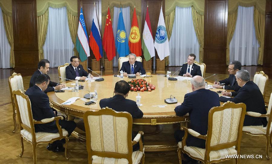 Kazakh President Nursultan Nazarbayev (C, back) meets with premiers of Shanghai Cooperation Organization (SCO) states, SCO secretary general, and director of the Executive Committee of SCO Regional Anti-Terrorist Structure in Astana, Kazakhstan, Dec. 15, 2014. (Xinhua/Huang Jingwen)