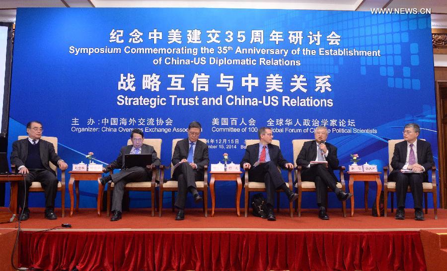 Participants speak during a discussion on Strategic Trust and China-US Relations, part of the Symposium Commemorating the 35th Anniversary of the Establishment of China-US Diplomatic Relations which is held in Beijing, capital of China, Dec. 15, 2014. (Xinhua/Chen Yehua)