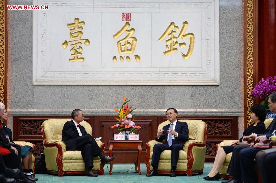 Chinese State Councilor Yang Jiechi (3rd R) meets with representatives of overseas Chinese participants of the Symposium Commemorating the 35th Anniversary of the Establishment of China-US Diplomatic Relations, in Beijing, capital of China, Dec. 15, 2014. (Xinhua/Chen Yehua)