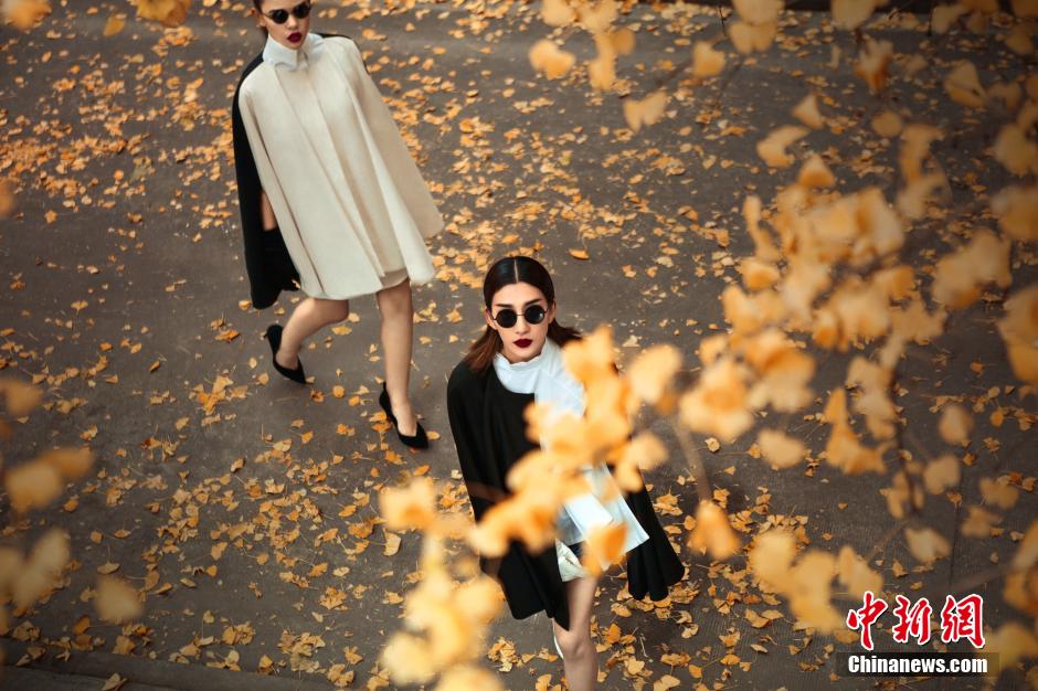 December is the best month to enjoy the gingkos in Chengdu. In Jinxiu Lane of the Wuhou District, two models take fashion photos. (Chinanews/Zhong Xin)