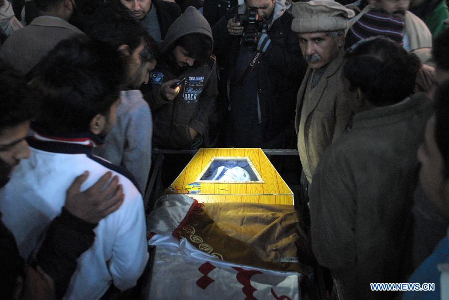 | Mourners attend the funeral of a student who was killed in an attack by militants on an army-run school in northwest Pakistan's Peshawar on Dec. 16, 2014. A total of 141 people including 132 students and nine staff members were killed and 133 others injured in Tuesday's terror attack at an army-run public school in Pakistan's northwest city of Peshawar, said a spokesman of the Pakistani army. (Xinhua/Umar Qayyum) |