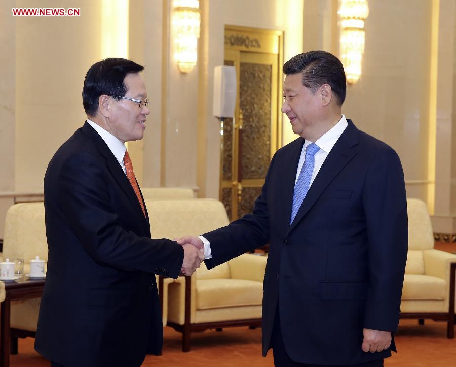 Chinese President Xi Jinping (R) meets with Chung Ui-hwa, speaker of the National Assembly for the Republic of Korea(ROK), in Beijing, China, Dec. 18, 2014. (Xinhua/Ding Lin)