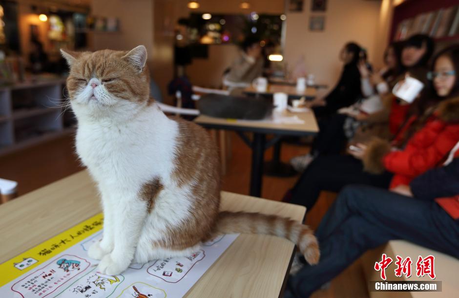 A coffee shop themed with kitties and books opens in Nanjing, Dec. 17, 2014. There are 20 different cats in the store including garfield, siamese cat, shorthair. Many people come to the store to enjoy reading books with a cup of coffee and kitties around. (Chinanews/Yang Bo)