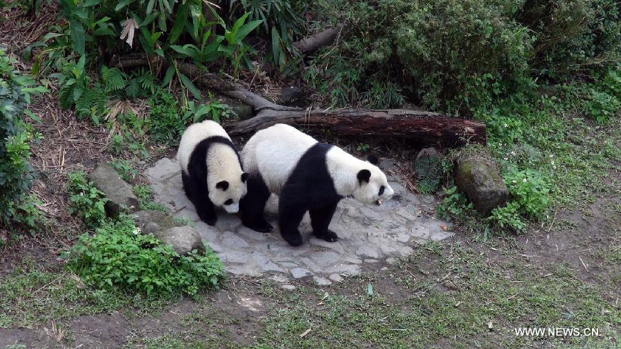 Giant panda cub Yuan Zai (L) and its mother Yuan Yuan stay at the Taipei Zoo in Taipei, southeast China's Taiwan, Dec. 18, 2014. The cub, born on July 6, 2013, has begun to learn how to live independently. It is the first baby of giant pandas Tuan Tuan and Yuan Yuan, which were given as goodwill gifts to Taiwan by the Chinese mainland. (Xinhua)