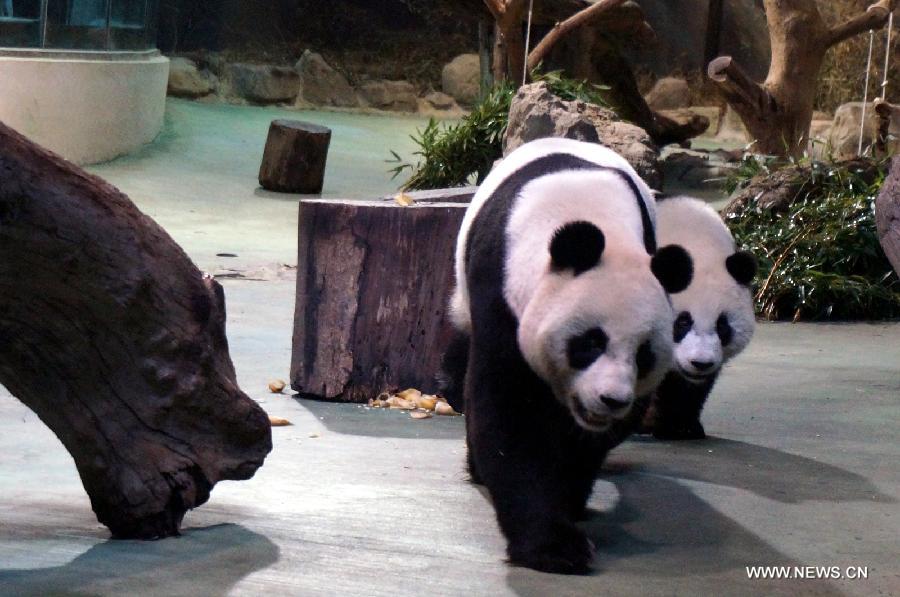 Giant panda cub Yuan Zai (back) and its mother Yuan Yuan stay at the Taipei Zoo in Taipei, southeast China's Taiwan, Dec. 18, 2014. The cub, born on July 6, 2013, has begun to learn how to live independently. It is the first baby of giant pandas Tuan Tuan and Yuan Yuan, which were given as goodwill gifts to Taiwan by the Chinese mainland. (Xinhua)