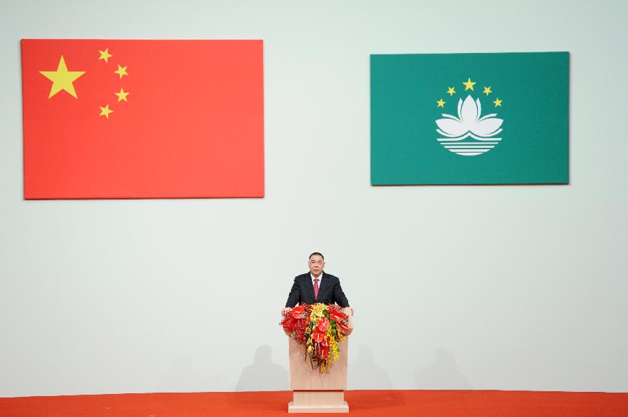 Chui Sai On, the fourth-term chief executive of the Macao Special Administrative Region (SAR), delivers a speech at an inauguration ceremony and a celebration gathering marking the 15th anniversary of Macao's return to the motherland in Macao, south China, Dec. 20, 2014. Chinese President Xi Jinping attended the celebration gathering and the inauguration of the fourth-term chief executive and government of the Macao SAR on Saturday morning. (Xinhua/Zhang Duo)