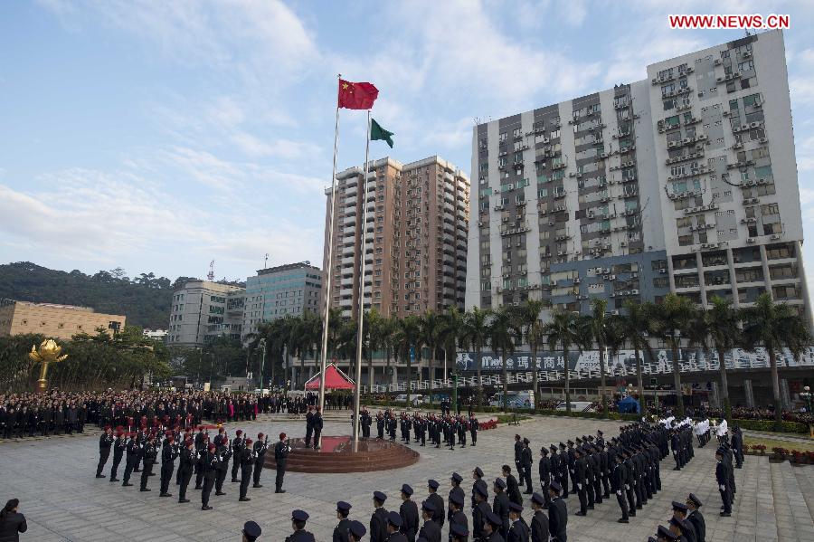 A flag-raising ceremony is held to celebrate the 15th anniversary of Macao's return to the motherland in Macao, south China, Dec. 20, 2014. (Xinhua/Lui Siu Wai)