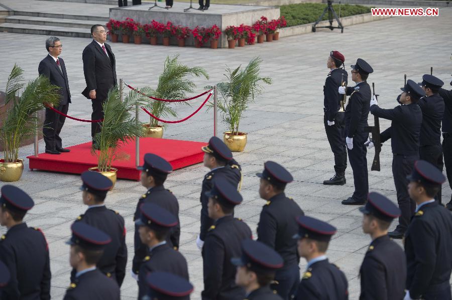 Chui Sai On (2nd L), Chief Executive of the Macao Special Administrative Region, attends a flag-raising ceremony to celebrate the 15th anniversary of Macao's return to the motherland in Macao, south China, Dec. 20, 2014. (Xinhua/Lui Siu Wai)